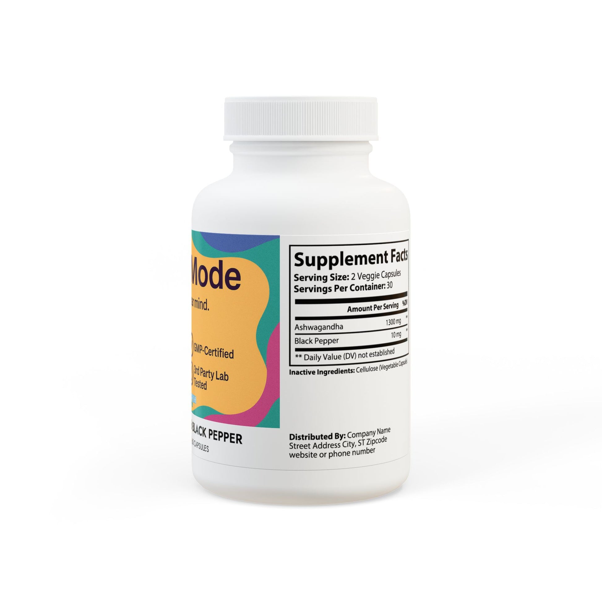 Ingredients: Ashwagandha, Black Pepper. Inactive Ingredients: Cellulose (Vegetable Capsule).